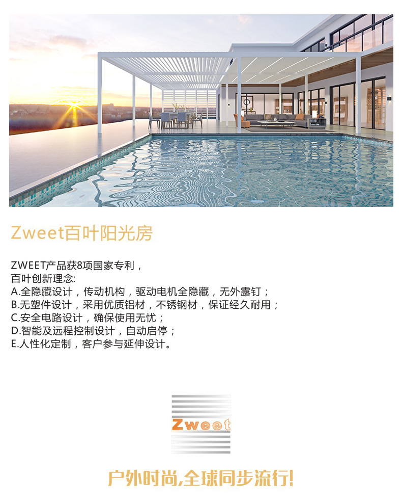 8.陽光房的四周可選擇安裝玻璃百葉窗,木制百葉窗,鋁合金百葉窗,玻璃滑動門及垂直的玻纖遮陽卷簾,完善您的百葉房功能。