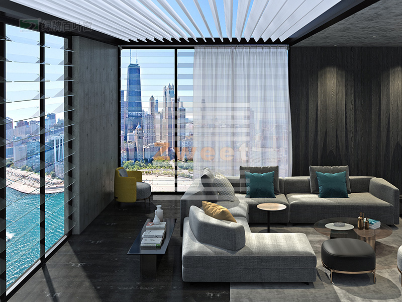 頂面鋁合金百葉系統(tǒng)轉(zhuǎn)角度可達(dá)125度,您可以根據(jù)自己的需要來(lái)控制百葉旋轉(zhuǎn)角度,